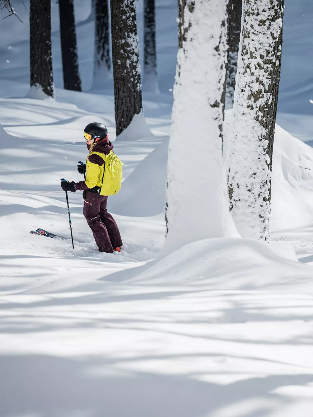 Um den Rucksack auch unterwegs bestmöglich anzupassen, kann er durch seitlich integrierte Gurtbänder schnell komprimiert werden und faltet sich zu einer flach anliegenden, zweiten Haut am Rücken. Zum Abseilen in steilen Rinnen oder bei kurzen Geh-Passagen hat der Freeride-Rucksack alle nötigen Befestigungsmöglichkeiten für Ski, Eispickel oder Seil, und auch das bewährte Helmnetz, die Notfallkarte und Trinksystemvorbereitung fehlen nicht. Dabei sind alle Features außen gut verstaut, um selbst in unwegsamem Gelände nirgends hängen zu bleiben.