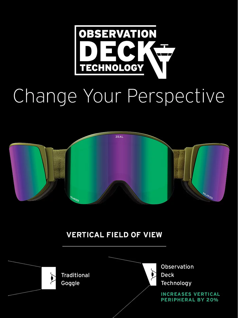 Die Observation Deck Technology ist das erste Brillensystem, das die Sicht des Adlers auf die Berge nachbildet, damit du jeden Zentimeter deiner Line sehen kannst. Erhältlich in der revolutionären Zeal Optics Beacon-Brille.